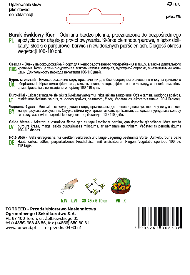 Odmiana bardzo plenna o okresie wegetacji 100-110 dni. Burak o cylindrycznym korzeniu, zagłębiony w glebie do połowy. Skórka ciemnopurpurowa z nieznacznym skorkowaceniem górnej połowy. Miąższ delikatny, słodki o purpurowej barwie i niewidocznych pierścieniach. Długość okresu wegetacji 100-110 dni. Odmiana bardzo plenna.