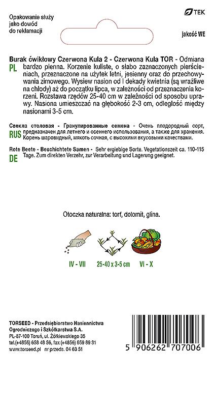 Odmian bardzo plenna. Korzenie kuliste, o słabo zaznaczonych pierścieniach, przeznaczone na użytek letni, jesienny oraz do przechowywania zimowego. Wysiew nasion od I dekady kwietnia ( są wrażliwe na chłody ) aż do początku lipca, w zależności od przeznaczenia korzeni. Rozstawa rzędów 25-40 cm w zależności od sposobu uprawy. Nasiona umieszczać na głębokość 2-3 cm, odległość między nasionami 3-5 cm. Gramatura – 100 nasion.