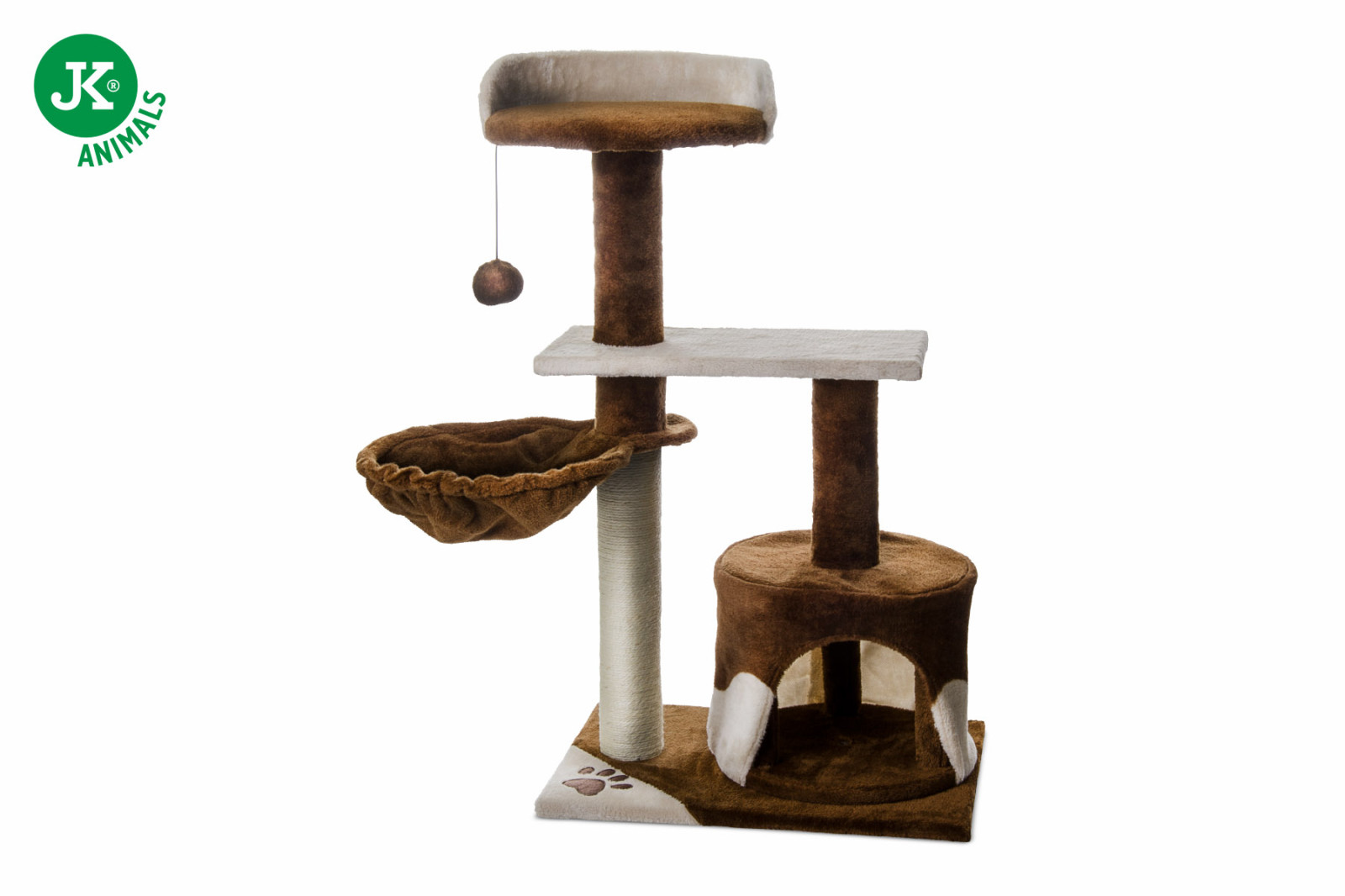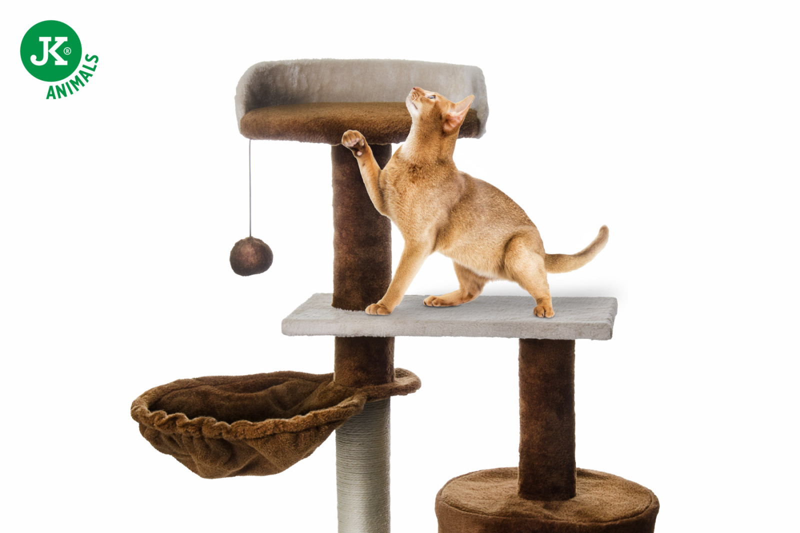 Na sznurku znajduje się także pompon, którym koty lubią się bawić. Kolumna owinięta jest trwałym, naturalnym sizalem, odpowiednim do pielęgnacji i utrzymywania pazurów.