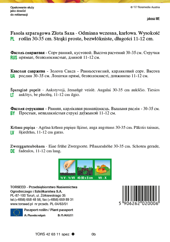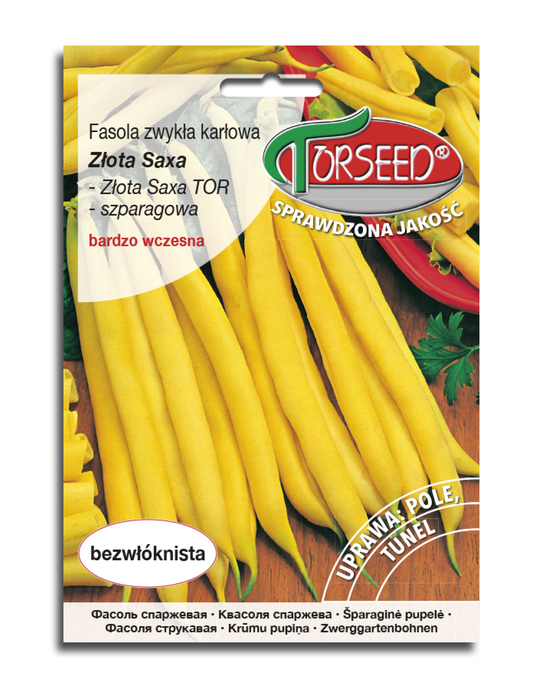 Fasola szparagowa Złota Saxa. Odmiana bardzo wczesna, karłowa. Okres wegetacji od siewu do zbioru ok. 60 dni. Wysokość roślin 40-45 cm. Strąki proste, bezwłókniste, długości 11-12 cm. Dojrzewają stopniowo. Nasiona białe. W 1 kg średnio 220 strąków. Zastosowanie: bezpośrednie spożycie, mrożonki i konserwy.