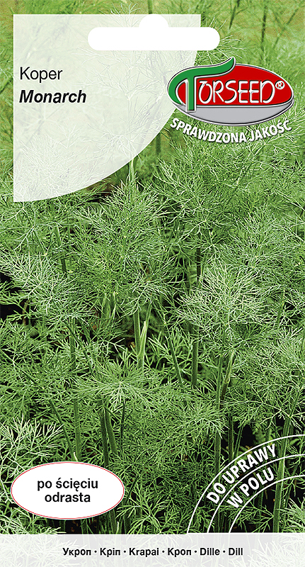 Koper Monarch - Odmiana o silnym aromacie, silnie krzewiąca się o niebiesko-zielonych liściach. Odmiana wysoko-plonująca o bardzo małej skłonności do kwitnienia. Koper przydatny do zbioru na zielono (od siewu do cięcia 45 dni) i na pęczki (od siewu do wyrywania 65-75 dni). Doskonale odrasta po cięciu, które można przeprowadzić trzykrotnie. Norma wysiewu: 2-3,5 g/1m2.