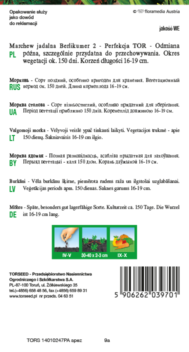 Marchew Berlikumer 2 – Perfekcja TOR. Odmiana późna, bardzo plenna. Szczególnie przydatna do przechowywania i przetwórstwa. Okres wegetacji ok. 150 dni. Korzeń spichrzowy długości 16–19 cm, lekko stożkowaty, o tępej nasadzie. Walec osiowy średniej wielkości, barwą podobny do kory (pomarańczowy). Miąższ soczysty, wyjątkowo smaczny. W uprawie na redlinach uzyskuje się lepszą jakość plonu.