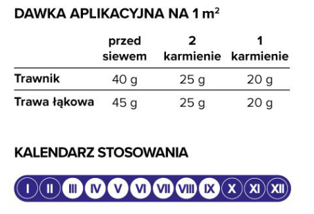 Pielęgnacja trawnika: Stosować trzykrotnie w ciągu sezonu od marca do września, w odstępach 60 dniowych.
