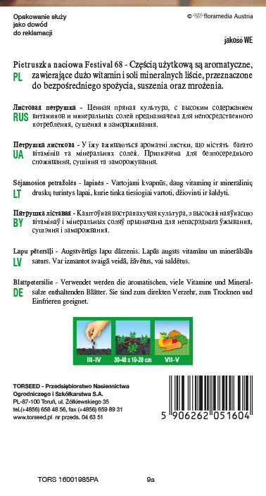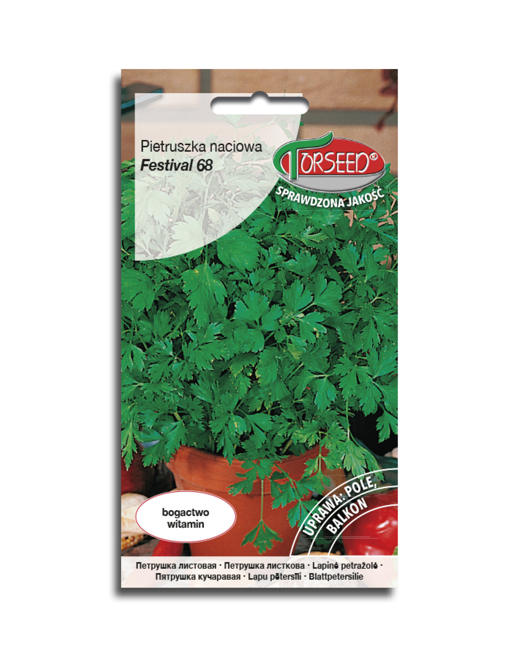 Pietruszka naciowa Festival 68. Cenna roślina przyprawowa i dekoracyjna użytkowana w ciągu całego roku. Przydatna również w produkcji suszu. Liście gładkie, intensywnie zielone, o silnym aromacie, bogate w witaminy i sole mineralne, polecane jako dodatek do potraw. Nać gęsta, odporna na żółknięcie, tolerancyjna wobec mączniaka prawdziwego.