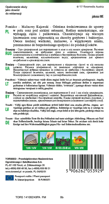 Pomidor niski Malinowy Kujawski. Odmiana średniowczesna do uprawy w polu oraz pod niskimi osłonami. Rośliny samokończące, nie wymagają cięcia i palikowania. Charakteryzuje się wiernym plonowaniem oraz odpornością na choroby grzybowe i bakteryjne. Owoce średniej wielkości, malinowe, o wyjątkowym smaku, przeznaczone do bezpośredniego spożycia i do produkcji soków. Gramatura – 0,2 grama.