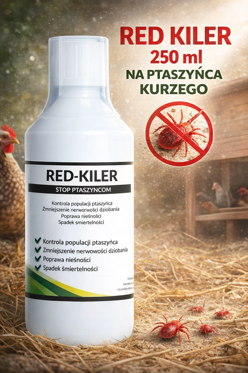 RED KILER 250 ml to skuteczne, naturalne wsparcie w walce z jednym z najtrudniejszych pasożytów drobiu. Regularne stosowanie pomaga utrzymać czysty, bezpieczny kurnik i zdrowe, spokojne ptaki ????