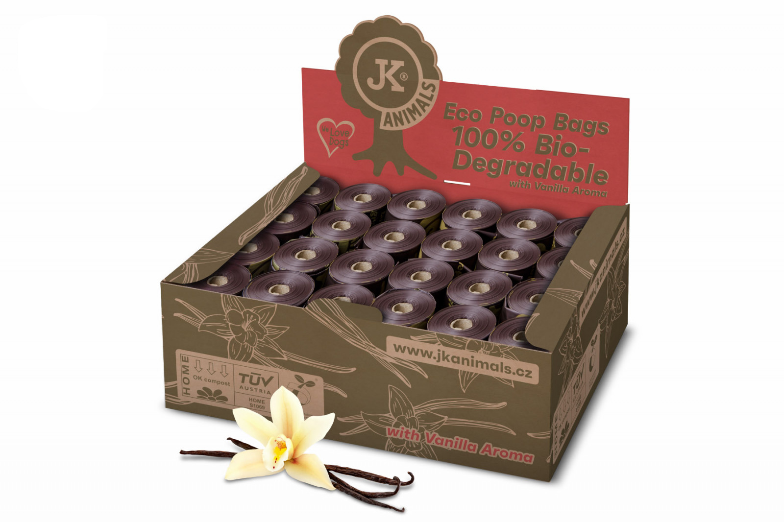 Biodegradowalne woreczki na psie odchody o zapachu wanilii. Brązowe woreczki o zapachu wanilii ze skrobi kukurydzianej, same się rozkładają. Woreczki z certyfikatem TÜV. Pojemnik zawiera łącznie 360 pojedynczych woreczków, 24 rolek. Dzięki tym woreczkom ratujesz przyrodę i zmniejszasz obciążenie planety odpadami z tworzyw sztucznych.